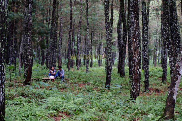 Wisatawan dapat menikmati kesejukan berada di bawah pohon pinus.